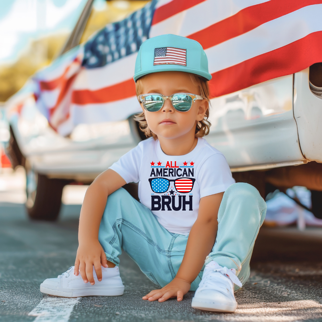 The "All American Bruh" tee brings the perfect blend of red, white, blue — and serious cool kid vibes. Featuring patriotic shades and bold lettering, this design is made for fireworks, BBQs, and being the life of the party (or at least the driveway parade).